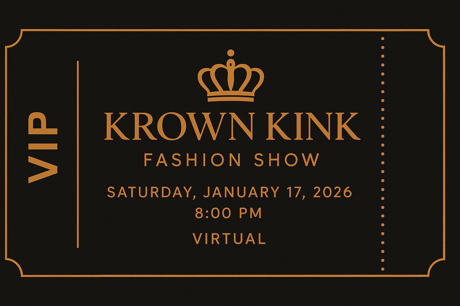 Join us for the Krown Kink Virtual Fashion Show on Saturday, January 17th, 2026, at 8:00PM. Step into a world of elegance, empowerment, and bold expression as Krown Kink debuts its newest collection. This exclusive virtual event showcases innovative designs, signature silhourttes, and the luxury couture energy that defines the brand.